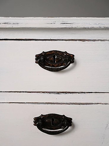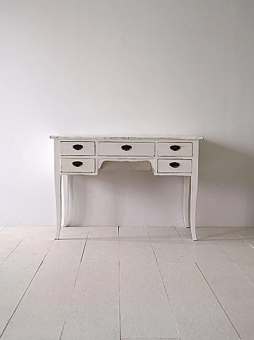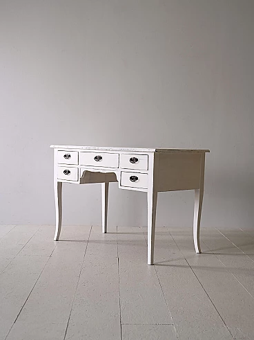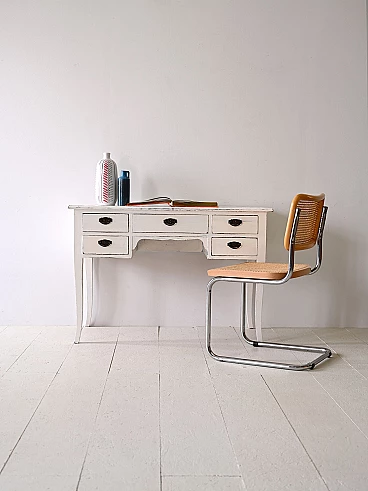 1940s white writing desk with metal handles. Art Deco-style white desk with dark-coloured metal handles. This original vintage office desk features a large work surface with slightly curved smaller sides that add a touch of elegance. The frame has four side drawers and one central drawer, providing ample storage capacity to keep your desk tidy. The tapered legs add lightness and modernity to the desk, blending perfectly with the style of the cabinet. Good condition. A conservative restoration was carried out using natural materials. It may show signs of time. Please pay attention to the photographs.