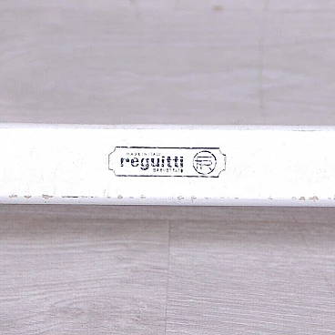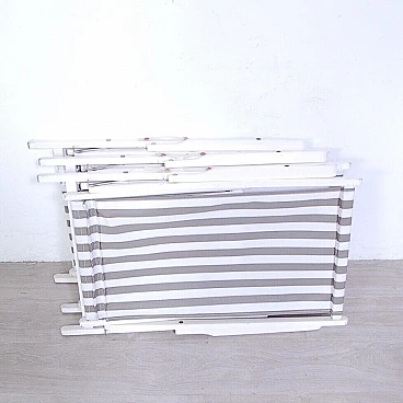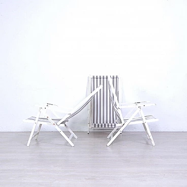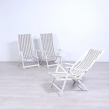 Set of three folding deck chairs by Fratelli Reguitti, circa 1970s. Brand on the rear lower tie rod. Structure in white painted wood, a single strip of fabric creates the seat and back. Recently replaced fabric, characterized by a simple white and gray vertical striped decoration. The old plastic handles, created to facilitate the transport of deckchairs, are still present; to date the plastic is "burnt": two are already broken, the third will follow shortly. The weight of each deckchair is light making movement easy; they are easy and practical to open and close. Closed they measure 97 x 55 x 10 cm. In the deckchair version the maximum height is 80 cm, the width is 57 cm, the depth is 107 cm; the seat is 33 cm high. In the chair version the maximum height is 105 cm, width 57 cm, depth 69 cm; the seat is 33 cm high. Good vintage condition with normal signs of wear on the wooden parts; fabric just replaced, deteriorated plastic handles (see photos).