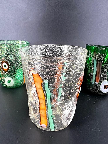 Set of eight tumblers called "Goti" made of Murano glass. Handmade in Murano without the use of molds. These glasses are the result of the craftsmanship of our master glassmakers, who have skillfully worked Murano blown glass to create eight unique and distinct pieces. Handcrafted in our furnace, these tumblers feature yellow, orange, amber, light green and dark green glass and the addition of murrine and colored reeds, which add a touch of vibrancy and originality to the design. Each glass has its own shape, one is different from the other, creating a set that is a true masterpiece of Italian craftsmanship. These glasses are perfect for an upscale tasting experience or to decorate the table with elegance and style. Accurate shipping with professional packaging. Complete with certificate of originality.