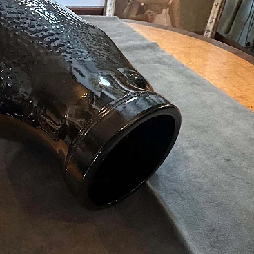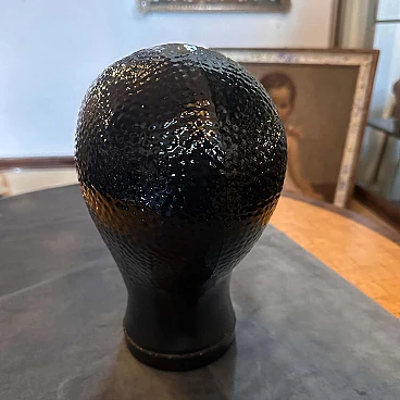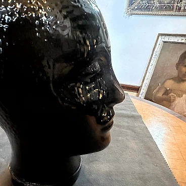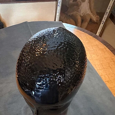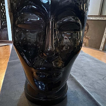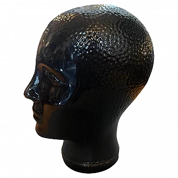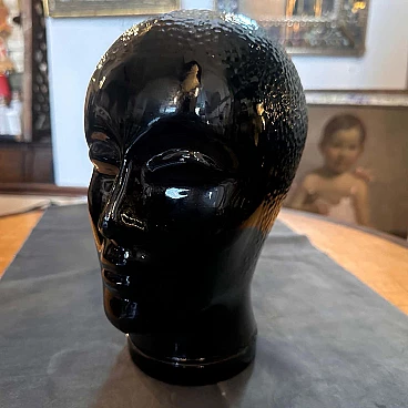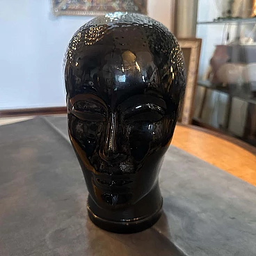 A black glass head signed and produced in Italy in the 1970s and attributed to Piero Fornasetti is in perfect condition. Fornasetti is known for his whimsical and distinctive designs. The 1970s marked a period of creative expansion for the Fornasetti brand. During this period the company continued to produce a wide range of decorative objects, furniture and art pieces that reflected the spirit of the time. Black glass gives it an elegant and sophisticated aesthetic. Glass, with its reflective and translucent qualities, adds a touch of luxury to the piece. The modernist movement embraced clean lines and geometric shapes. The head has a minimalist design that captures the essence of modernist art.