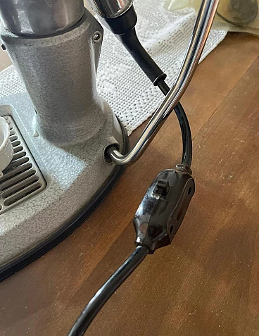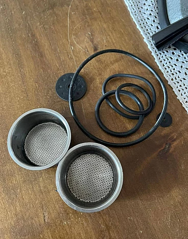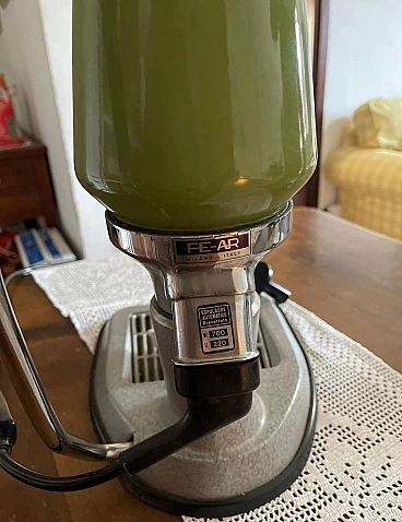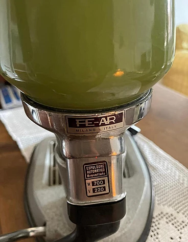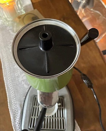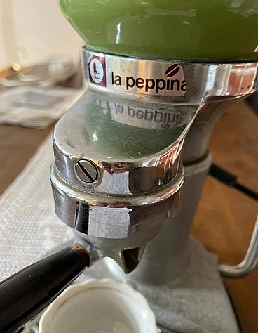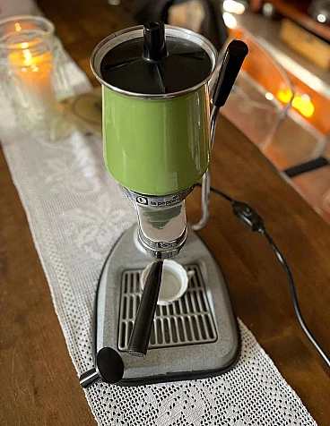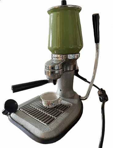 Machine model 'La Peppina Termomatica' manufactured by Fe-Ar of Milan. The manufacturer's initials derive from the initials of the owner and designer Felice Arosio, known for having invented the 'Faemina' model. The Termomatica version is equipped with a thermostat and is the latest series produced by Fe-Ar. The original Italian patent dates back to 23 December 1957. Later, it was also patented in other countries, such as Austria and the United Kingdom. The Peppina is an open boiler machine with a spring-loaded piston, simple and light. By means of an accessory hermetic lid, it is possible to transform the Peppina into a closed boiler machine, so that the steam wand can be used to prepare cappuccinos, punch, tea etc. The lever for compressing the piston spring, unlike other machines of the time, instead of being placed on the body of the machine, is placed on the base of the machine. The enamelled sheet metal boiler was produced in different colours. Although in working order, it is advisable to check the gaskets, as can be seen from the photos, some new gaskets are already given with the machine.