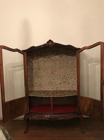 Rounded display case in briarwood with velvet damask back, early 20th century
