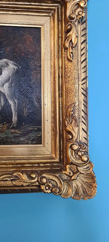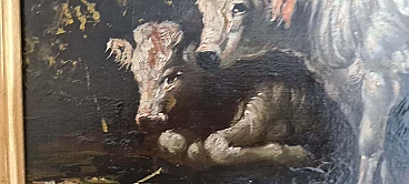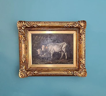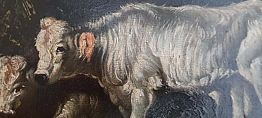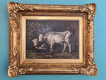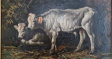 Early 20th-century oil painting on canvas depicting a rural scene with two white-coated cows, one of which is lying down and the other standing, surrounded by dark nature. The painting is unsigned but can be placed, due to the type of painting, in the scenario of Piedmontese painters of the early 20th century. Done with decisive and expert strokes, the scene is of extraordinary realism and beauty. It is accompanied by a stunning and important coeval frame carved and gilded with gold leaf. Both the painting and the frame are in excellent conservation condition.