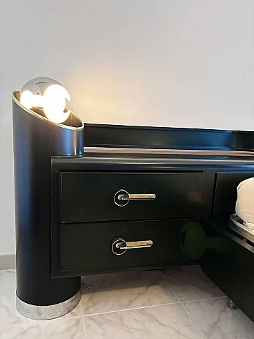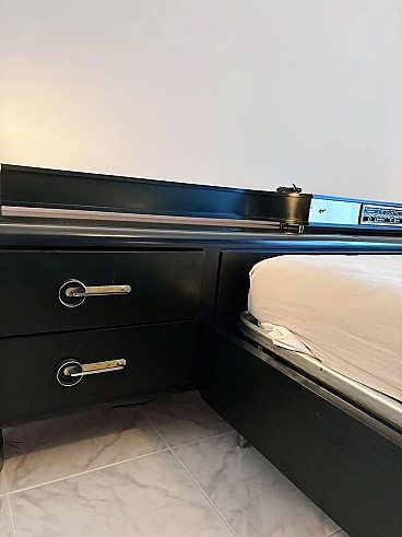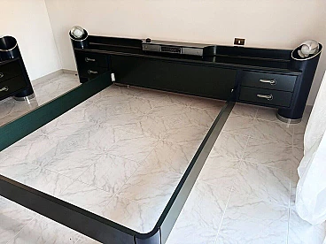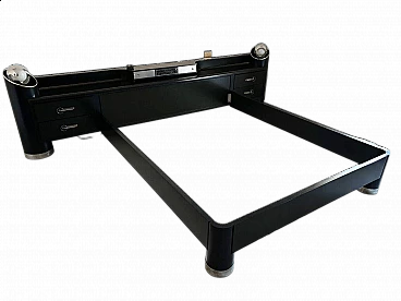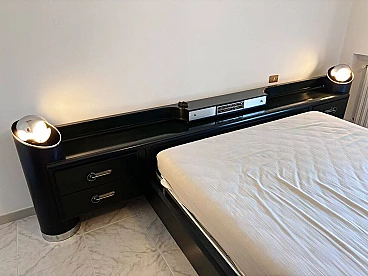 Bed easily attributable to Vittorio Introini for Saporiti Italia. Structure entirely in lacquered wood, bedside table handles in chromed steel, details also in steel. Space Age lamps and Europhon stereo included. The item is in excellent conservative condition, there are no aesthetic or structural defects to report, only slight and obvious signs of aging.