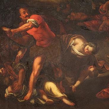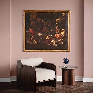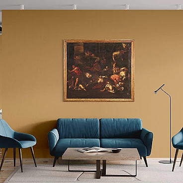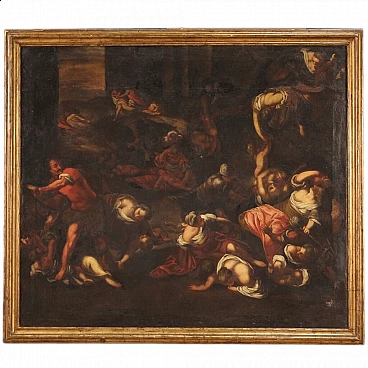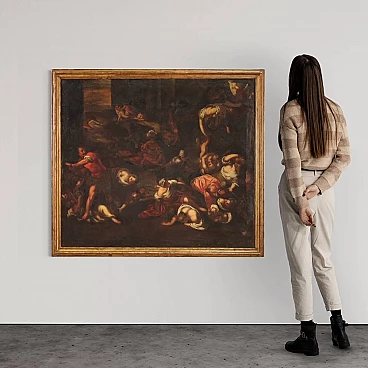 Antique Italian painting from the first half of the 17th century. Oil painting on canvas, first half of the 17th century, depicting a high quality copy of The Massacre of the Innocents by Jacopo Robusti known as Tintoretto. The work is a mirror image of the master's original in the Scuola di San Rocco in Venice. According to the Gospel story, Herod the Great, King of Judea, ordered the massacre of children with the aim of killing Jesus, of whose birth he had been informed by the Magi who had come from the East. An angel warned Joseph in a dream, ordering him to flee to Egypt and only after Herod's death did he return to Galilee. A work of excellent pictorial quality characterised by great dynamism and a skilful use of chiaroscuro. 20th-century carved and gilded wooden frame, pleasantly decorated, with some signs of time. Painting that has undergone restoration with partial re-staining and restoration of colour in places (see photo). Overall in good state of preservation. Light painting H 112.5 x W 130 cm.