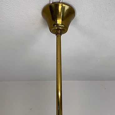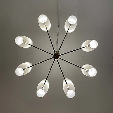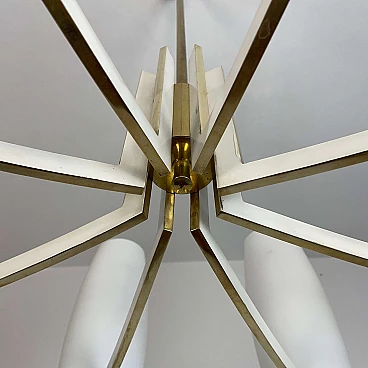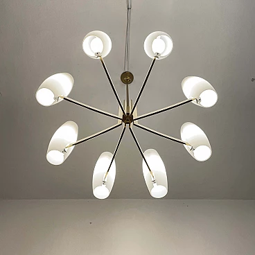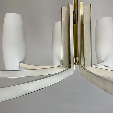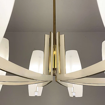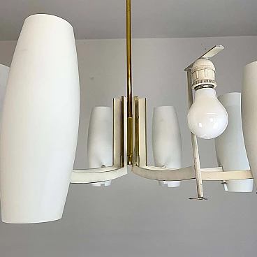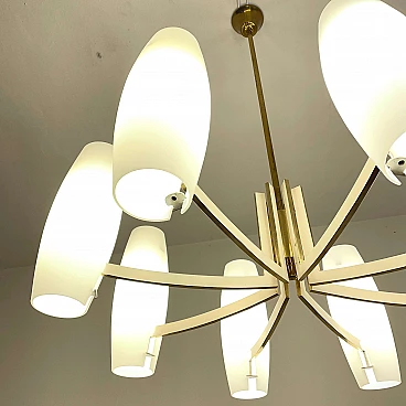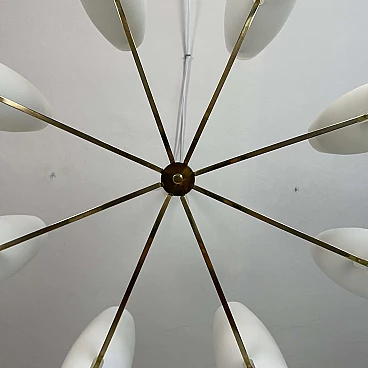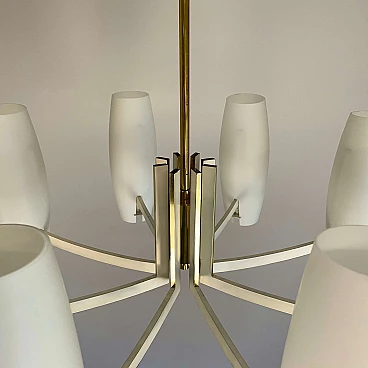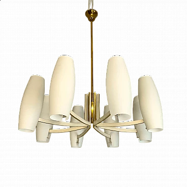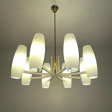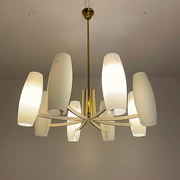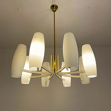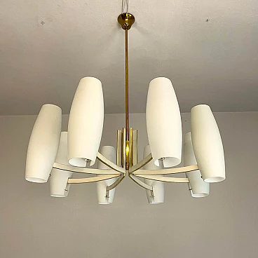 Eight-light brass and opaque opaline glass chandelier, 1950s