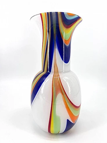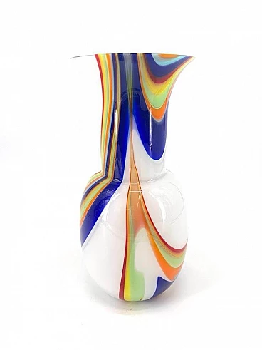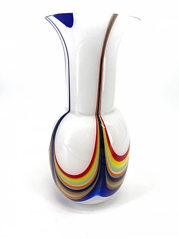 Express your passion for the art of glassmaking with this Murano glass vase, a combination of modernity and tradition. Made with craftsmanship, the vase's white glass is enriched with vibrant coloured canes, creating a unique piece that transforms any room. Each vase is a unique work of art, shaped with care and craftsmanship by skilled Murano artisans. The manual workmanship ensures that each piece is one-of-a-kind. The white colour of the glass adds a touch of purity and elegance, creating a perfect background for the vibrant coloured canes. The contrast between the simplicity of the white and the liveliness of the canes makes the vase a visually striking decorative element. The coloured canes are cleverly integrated into the glass, adding an eye-catching note of colour. These decorative elements give the vase a contemporary and unique look. With its modern shape and design, this vase fits perfectly in contemporary settings, adding a touch of sophistication and style. This Murano glass vase is not only a decorative element, but a statement of style and contemporary art. Place it strategically to add a note of modern elegance to any room, from the dining room to the living room. Each vase comes with a certificate of authenticity, confirming that it is an authentic piece of Murano glass, made with passion and craftsmanship. Add a touch of modernity and tradition to your home with this extraordinary vase, a masterpiece that brings with it the beauty and centuries-old craftsmanship of Murano glassmaking.