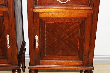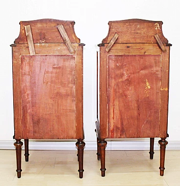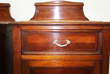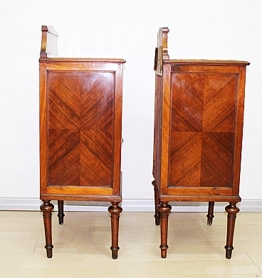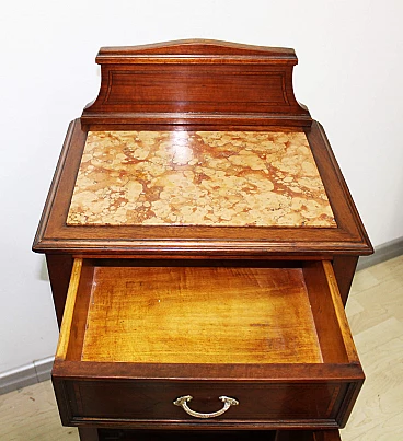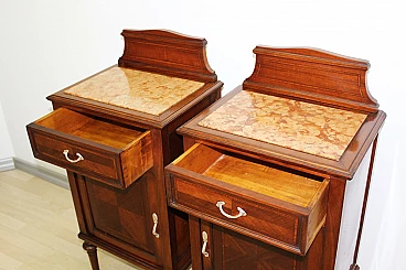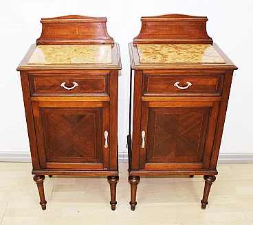 Pair of solid walnut bedside tables with inlays and Sicilian pink marble top. Dating from the first half of the 20th century, they were recovered from a 19th-century villa where a Sicilian Baron of Misterbianco lived. In excellent condition, they have been cleaned and given a coat of beeswax. They are elegant and functional with a drawer and a door. Vintage handles. These vintage/antique items may show some signs of wear such as scratches and other signs of time. Height with riser 98 cm (38.58 inch), height to marble 84 cm (33 inch), width 44 cm (17.32 inch), depth 34 cm (13.38 inch). We have been in this business for generations, we have customers all over the world, don't worry about your purchase, the goods travel insured, and in any case, we are responsible for the goods until they reach the customer, write to us privately for further information.