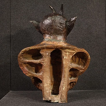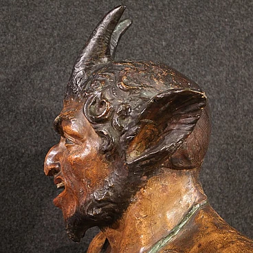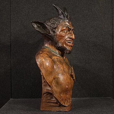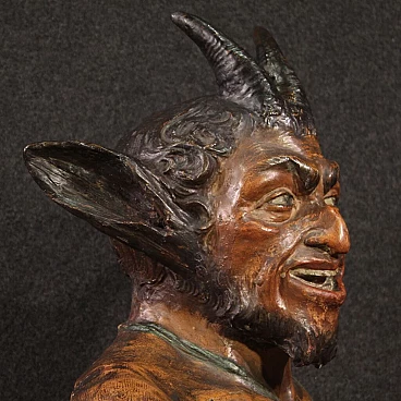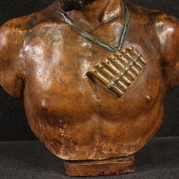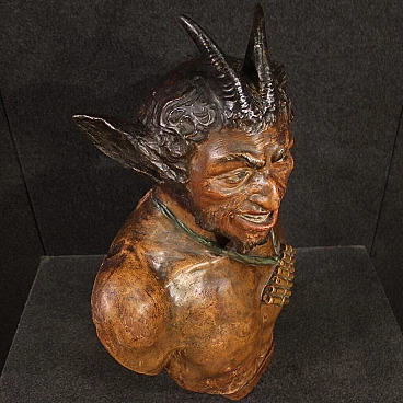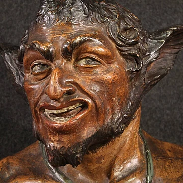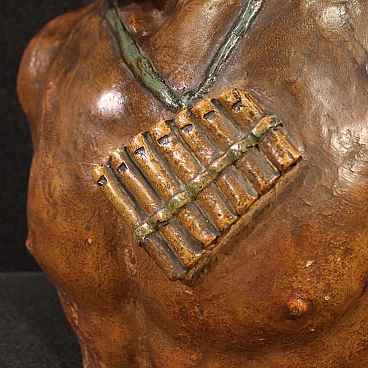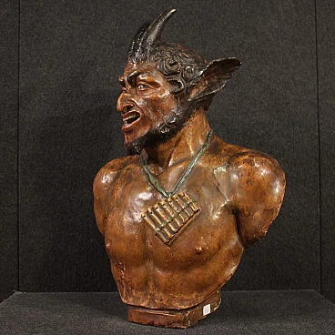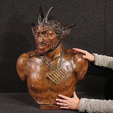 Large French sculpture from the second half of the 19th century. Polychrome terracotta work depicting a mythological subject, specifically the bust of the God Pan; of great quality and personality, with an almost grotesque character. A non-Olympian deity with the appearance of a satyr or faun, he represents the force of nature. From his name then derives the word panic, for if disturbed he would emit terrifying screams causing uncontrolled fear. Hard-to-find statue in beautiful patina, for antique dealers, interior decorators and collectors of antique sculpture. Finely detailed to the smallest detail, note tied around Pan's neck the flute with which he is often represented. This instrument is named Syrinx because according to the myth the nymph Syrinx, fleeing from the God eager to possess her, reached a stream of water and, unable to escape, invoked the Naiads (water nymphs) who transformed her into a bundle of marsh reeds that emitted a delicate sound when the wind blew; Pan then decided to build a new musical instrument to which he gave the name of the Nymph. Work in good condition, structurally solid, with some minor signs of time.