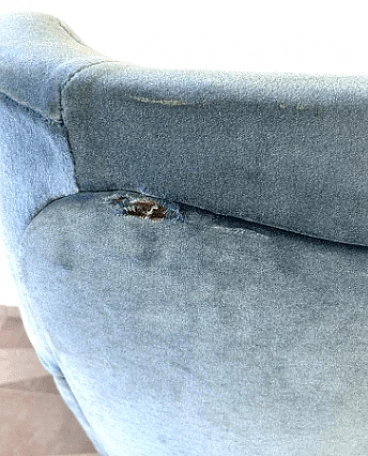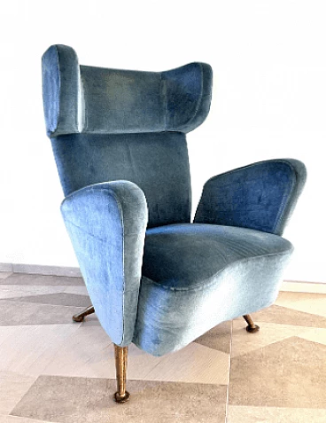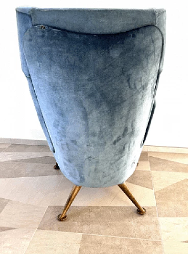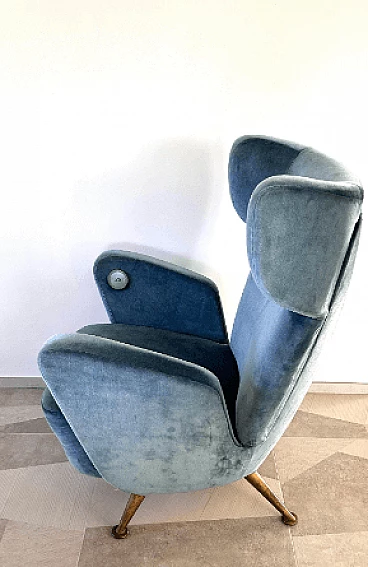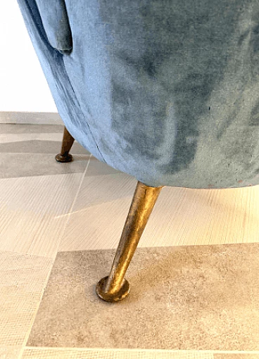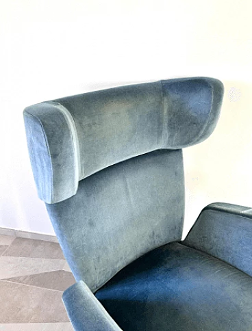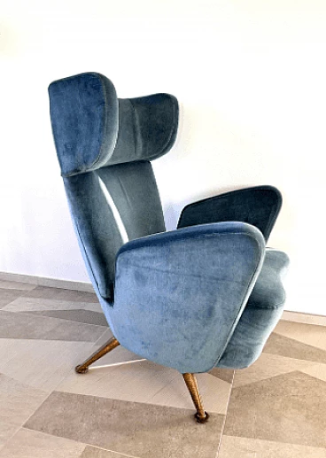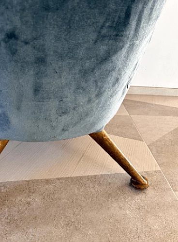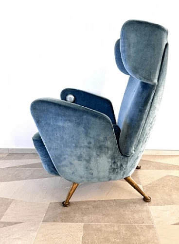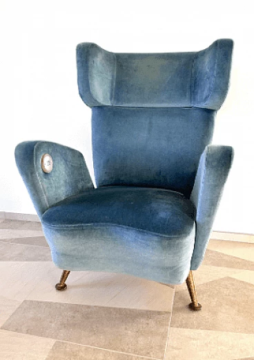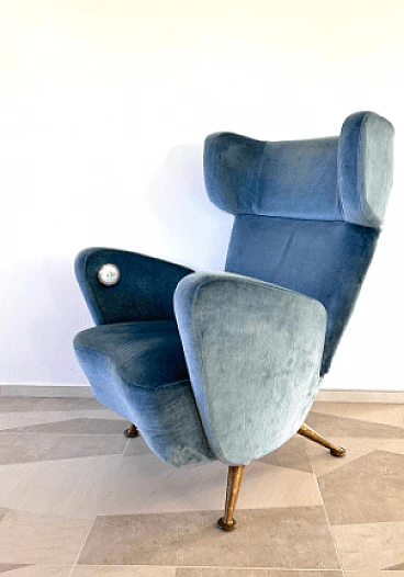 Rare armchair by Gio Ponti and Giulio Minoletti for the first class of the Settebello train, 1950s. Commonly known as Settebello, according to the name coined by the workers who built it, the seven-wagon Elettrotreno Rapido 300 (ETR 300) railcar was in operation at the Italian State Railways from 1952 to 1992. A truly unique vehicle, produced only in three examples from the Ernesto Breda company of Sesto San Giovanni (MI) with the idea of equipping the state railway fleet with a product that combined new technology and futuristic design. With a power of 2600 kW, more than double that of its predecessor ETR 200, the ETR 300 could easily reach 200 km/h, covering the entire Milan-Rome route in just 5 hours and 45 minutes, at an average of over 110 km/h, when the Rome-Florence direct route did not yet exist. The project, characterized by air-naval silhouettes on the outside, was signed by Gio Ponti, Giulio Minoletti and other famous architects and designers of the time, and included innovative glass walls, panoramic windows, lounges with movable armchairs, lounge restaurant and large bar, checked baggage service. Perhaps the most distinctive element were the two rounded end carriages which were designed with raised driving cabins to leave room below for comfortable viewing lounges for the 11 first class seats.