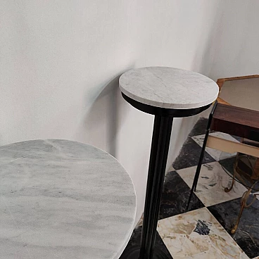 Pair of Art Deco ebonized wood columns with Carrara marble top, 1930s-40s. These columns are true works of art, expressing the geometry and refinement typical of the Art Deco style. The decorations are given by the four spheres that surround the base, which create an elegant contrast with the black of the wood and the white of the marble. The columns show signs of wear due to time, adding to their value and charm. They are rare pieces to find in this condition.