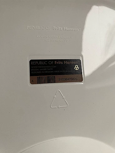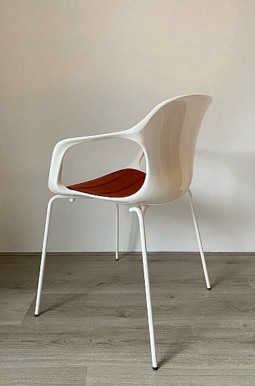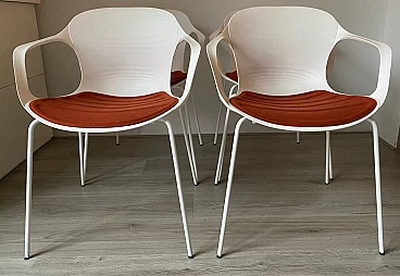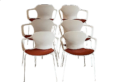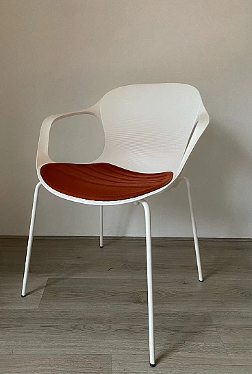 Set of six NAP armchairs with cushion by Kasper Salto for Fritz Hansen. NAP stackable armchair, single-mold ergonomic wraparound shell in creamy-white plastic, designed by Danish industrial designer Kasper Salto, born 1967. The backrest is flexible and adapts to the shape of the body, offering all-personal support. The armchair shell is made of polyamide, glossy on the outside, matte and striped on the inside to mark the pure lines of the seat. This material is recyclable, durable and easy to clean. The NAP armchair has armrests and is stackable. The set comes with cushions in brick-red textured fabric. The legs are made of steel, painted in the same color as the seat. They are from 2014 and in excellent condition.