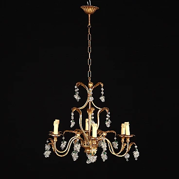 Six-light chandelier, 1900s. Iron, gilded wood and sheet metal structure forming leaf motifs from which hang transparent and colored crystal grape vines and sheet metal bobeches.