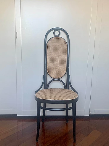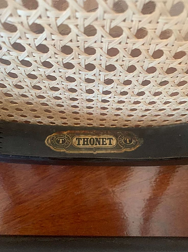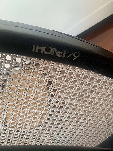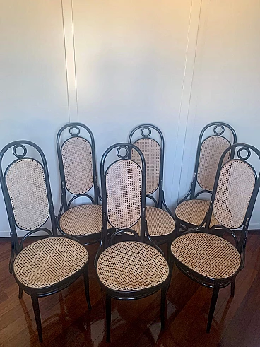Set of six chairs by Thonet purchased in the early 1980s. Black lacquered beech structure, beige Vienna straw back and seat. They are in good but used condition, they should be restuffed and lacquered in some places as there are obvious signs of use as pictured.