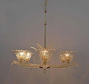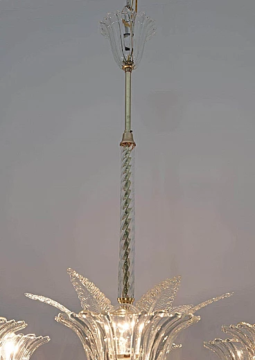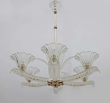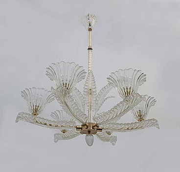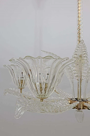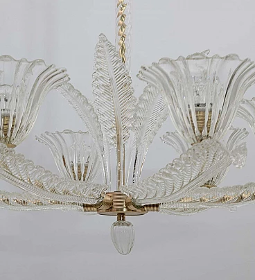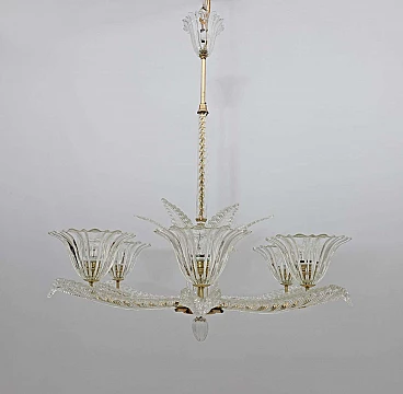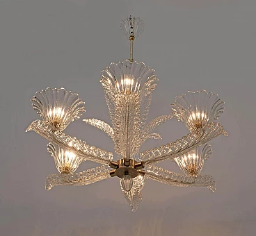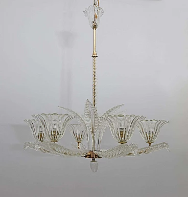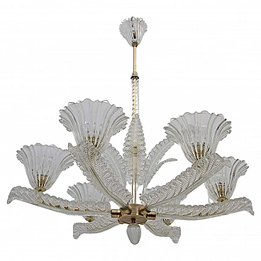 Six-armed glass chandelier with tulip-shaped lamp holder with leaf decoration in clear glass and brass. Designed by Ercole Barovier and produced by Vetreria Artistica Barovier & C in the late 1930s in Italy, this chandelier exudes the spirit and refinement of the period. Fully restored and ready to furnish your home. The chandelier is fitted with six lamp holders with E27 or E26 socket for the United States.