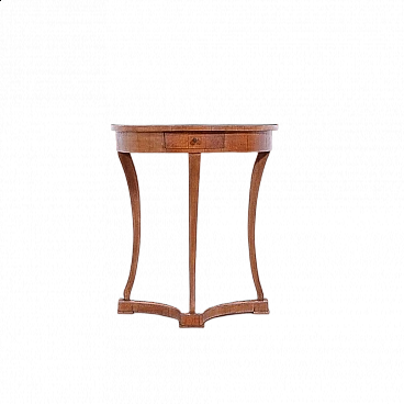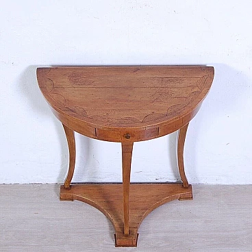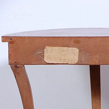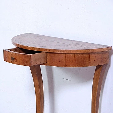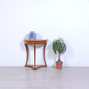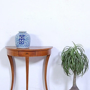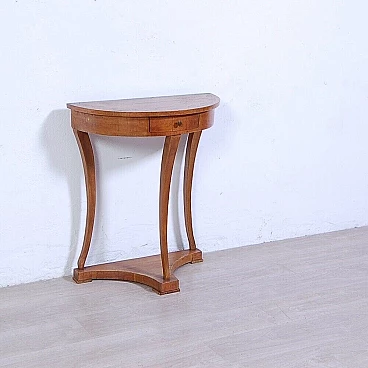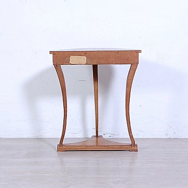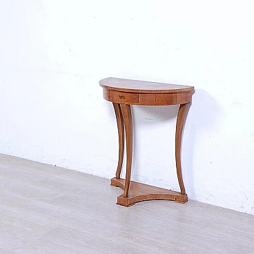 Walnut-root crescent-shaped console table with sabre legs, early 20th century