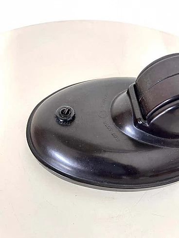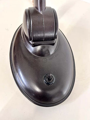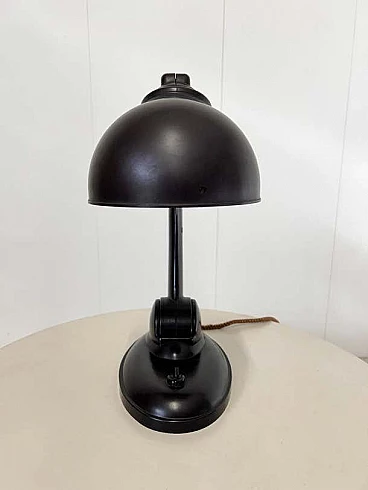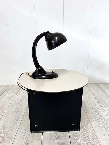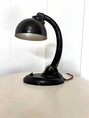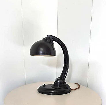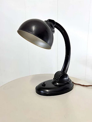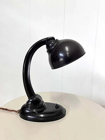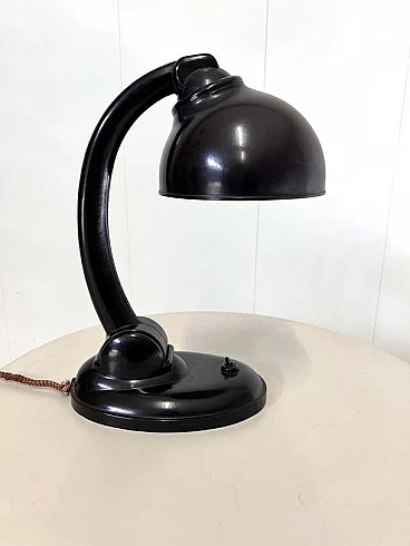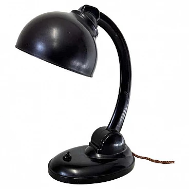 This modernist table lamp was designed in Britain in the 1930s by Eric Kirkham Cole. Cole was the founder and chief designer of the British electronics company EKCO, which specialised in the production of radios and later television sets using new materials such as plastic and Bakelite. The Czechoslovakian company Elektrosvit Nove Zamky obtained an exclusive licence from Cole to produce this version of the lamp with the number 11105 and produced it from the 1930s to the end of the 1940s. The base and shade are made of black Bakelite (very modern for the time). The lampshade is painted silver on the inside and can be adjusted to different positions by moving the steel rod. The lampshade, in particular, has a beautiful organic shape, typical of Cole's work in the 1930s, although it is most noticeable in his designs for radios. This shape is not only attractive and modern some 80 years after it was first produced, but also maximises the amount of light transmitted by this table lamp. This piece is in excellent vintage condition with slight natural wear on the inside of the shade. There are no chips or cracks on any part of the lamp.