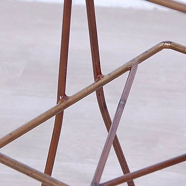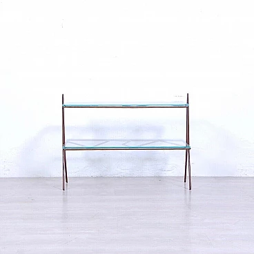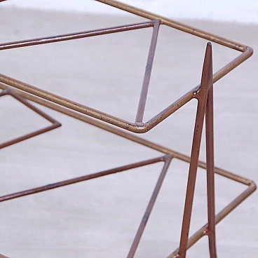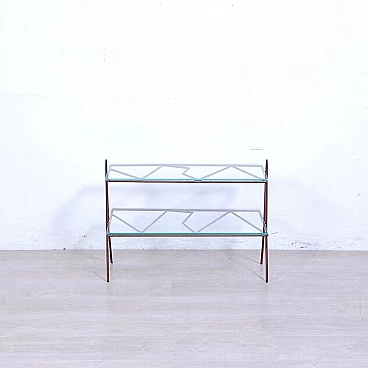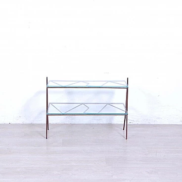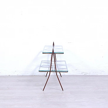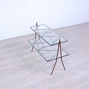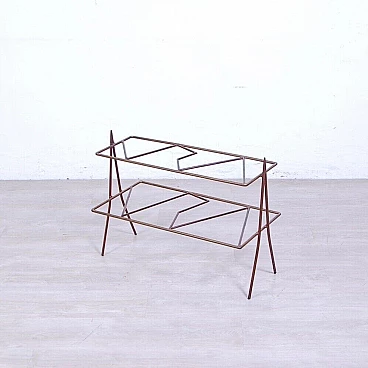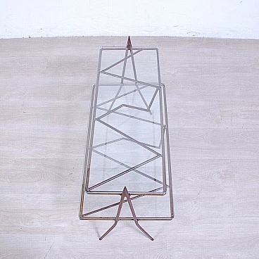 Handcrafted coffee table with iron frame and newly made glass tops. Design and production from the 1950s-60s, with very interesting shapes of the iron structure. Please note that the glass tops are only on the structure. Fidoil anti-rust treatment has been carried out to lock and maintain the iron's current condition. Width 69.5 cm, maximum depth 35 cm, depth of lower shelf 35 cm, depth of upper shelf 25 cm, maximum height 52 cm. Good condition, there are usual signs of wear and tear, new glass panes, just refinished (see photos).