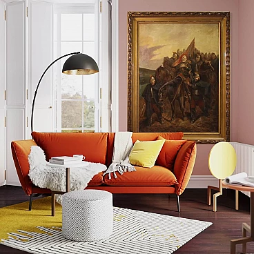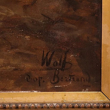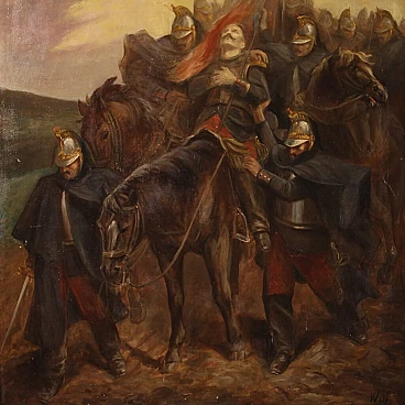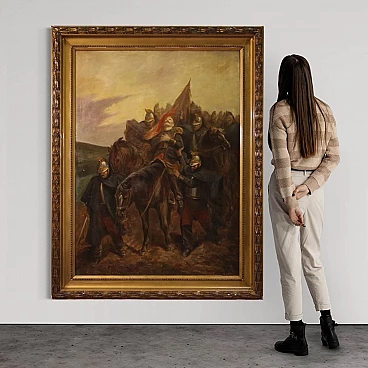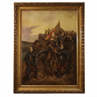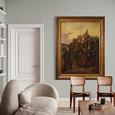 Great French painting of the second half of the 19th century. Oil painting on canvas, in the first canvas, depicting the return of the soldiers after the battle, good hand painting. Picture of Risorgimento character with numerous soldiers on horseback masterfully painted. Frame of the 20th century in wood and plaster carved and gilded, of great decoration. Painting of monumental dimensions that develops vertically, ideal to be inserted in an important hall or study. It has a signature on the bottom right during the study (see photo). Work that has undergone a conservative restoration during the twentieth century, on the whole in good condition. Painted light H 150 x L 111 cm.