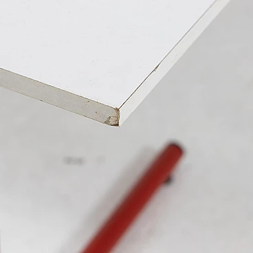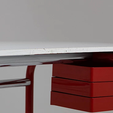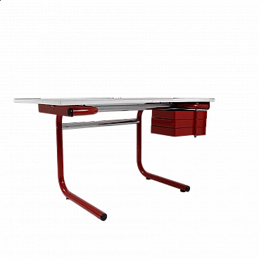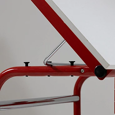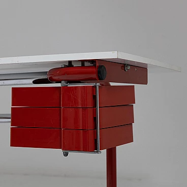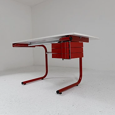 Desk with adjustable inclination mod. Pupil by Joe Colombo for Bieffeplast, 1970s. Equipped with a plastic chest of drawers that can be opened by rotating on a pivot. The desk top is covered with white formica (which shows signs of wear) and rests on a red painted metal structure with plastic parts. Manufacturer's label present.