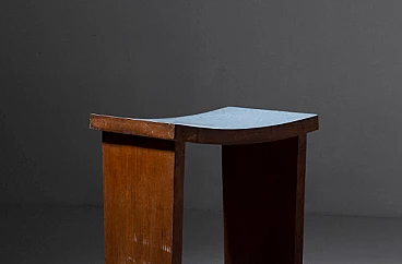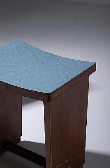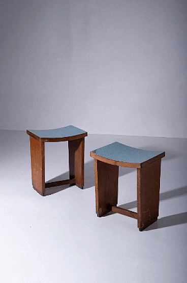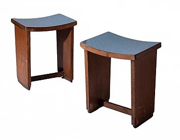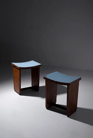 Imagine a pair of 1920s Italian Art Deco/Rationalist stools, frozen in time from a bygone era. These stools are more than just furniture, they are evidence of a design movement that celebrated precision, simplicity and functionality. The first thing that strikes you is their shape: rigid and sharp, a distinctive sign of Italian Rationalism. Each stool rests on two rectangular side legs, their lines crisp and unyielding. It's a design that exudes an air of seriousness and purpose. But it's the seat that adds a touch of intrigue to these stools: made from bent wood, it forms a slight semicircle, offering a comfortable yet subtly elegant perch. The seating surface, adorned with a layer of blue formica, is an artistic canvas with delicate white strokes, a nod to the attention to detail that defines these pieces. The material chosen for these stools is walnut wood, known for its timeless beauty and resistance. It is a choice that reflects both the era's respect for tradition and its pursuit of modernity. These stools, with rigorous and precise shapes, are the emblem of classic elegance with an Art Deco touch. They are the missing pieces that your discerning space desired. When you bring them into your home, you're not just buying furniture, you're buying a piece of Italian vintage furniture history. Seat height: 49 cm. In original condition of the time, they have defects and lacks on the feet (restoration is possible on request).