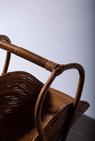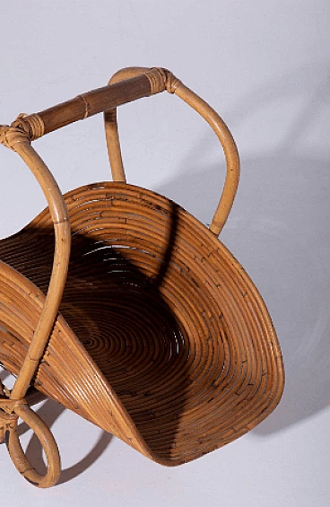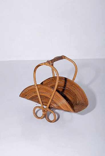 Here is a piece of furniture from the 1950s: an Italian magazine rack, made with love from an earthy and timeless material like bamboo. In its entirety, this magazine rack is a celebration of the natural beauty of bamboo, where meticulous craftsmanship accentuates the natural charm of the material. At first glance you will be struck by the transparency of its construction, allowing you to appreciate the very essence of bamboo in all its splendor. A marvel in itself is the basket containing the magazines, woven with bamboo canes to form a net and then gracefully curved to perfection. Even the load-bearing structure on the sides testifies to the skill of the craftsman. Bamboo, anchored together with rattan ropes, creates a sturdy yet aesthetically pleasing structure for the magazine bin. Every element of this piece seems to whisper the story of its creation. But what really sets this magazine rack apart are its circular feet, expertly handcrafted from bamboo. Their delicate curves and organic lines add a touch of harmony and beauty to this functional work of art. These feet not only provide stability but elevate the entire piece to a level of elegance that transcends mere utility. This magazine rack is more than just a functional accessory, it's a style statement and a nod to nature. It's an invitation to bring the wild into your home, to infuse your living space with the organic warmth of bamboo. Whether you're looking for natural, jungle-inspired decor or simply looking to infuse your living room with a touch of originality, this magazine rack is the perfect choice. Remember that even the simplest of everyday objects can be transformed into exquisite works of art if crafted with care and a deep appreciation for the materials used.