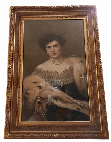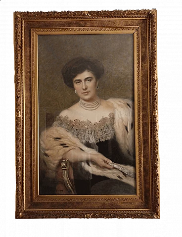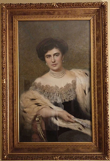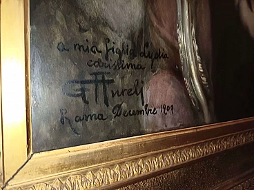 Painting by Giuseppe Aureli depicting a portrait of his daughter Lydia, 1909. Giuseppe Aureli (Rome, 1858 - Anzio, 1929) trained at the Roman school under Cesare Maccari and his contemporary Pietro Garbini, who directed him toward historical painting. He made his debut in Naples in 1883 exhibiting "An Appointment for Hunting in the 1500"; the following year he put on display in Turin "Charge of Lancieri d'Aosta at the Battle of Custoza in 1866"; in Bologna he was present with Emanuele Filiberto returning to Turin after the Battle of St. Quentin. It is all a succession of international exhibitions from Munich to Paris, from London to New York, where he enjoys considerable success. In 1894 he began exhibiting with the watercolorists as a guest, finally joining the Society in 1900. He made numerous appearances at the Society's periodic exhibitions in the following years; at the 1903 exhibition he exhibited "Portrait of a Lady" and "The 18th-century Toilet," at the 1907 exhibition "Impending Storm," at the 1910 exhibition, having become a councilor of the Society, he exhibited "The Tale," "Oriental Portrait" and "Marina," at the 1912 exhibition "Sur la place," and at the 1913 exhibition he presented "Tripoli," "In the Oasis" and "At the Court of Henry III of France." Mindful of Maccari's lesson, he mainly treats the historical picture, succeeding particularly well in portraiture, always rendered with grace and great skill. He is also remembered for his great virtuosity in the use of the difficult watercolor technique. He participated in the Espos. Naz. Italiana in Turin in 1898, at the Esposiz. Naz. B. A. of Rimini in 1909 and in several exhibitions of the Amatori e Cultori Society of Rome from 1900 until 1926.
