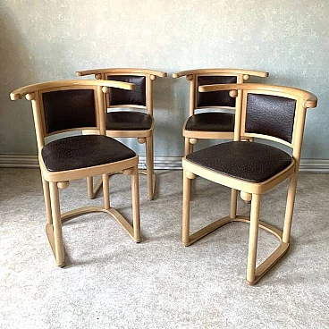 Four Fledermaus chairs in curved beech with padded seat and brown leather cover with points in relief. Model designed by the great Moravian architect Josef Hoffmann (1870-1956) for the performance hall of the 1907 Cabaret Fledermaus. Hence the name by which they are known "Cabaret". The chairs are in excellent condition. The structure is stable and solid and does not break. The leather cover is ok. Minimal signs due to use. The price of the single new chair is 1480 €, the price of the new set is 5900 €. Designed by Josef Hoffmann for the Wiener Werkstatte and listed in the catalogues J. & J. Kohn as model no. 728, the chair was chosen for the Viennese Fledermaus Cabaret, inaugurated in October 1907. For the time, design represented a bold and radical departure from the golden tradition of European nightclubs and immediately gained popularity. The wooden guides and balls on the connection points are typical of J. Hoffmann. They clearly show the influence of the Scotsman Charles Rennie Mackintosh, whose work helped shape Hoffmann from 1900: The revival of classicist ideals and the use of simple forms in Hoffmann’s work can be traced back to the forms of the founding master of the Glasgow school.