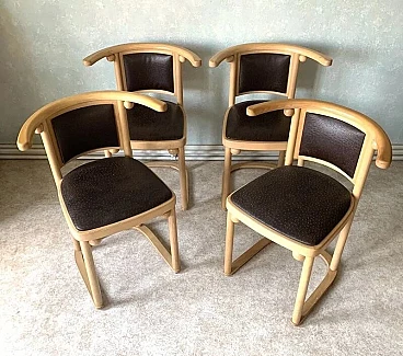 4 Fledermaus wood and brown leather chairs by Josef Hoffmann for Alivar, 1980s