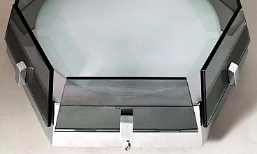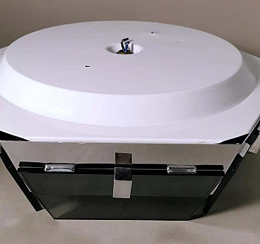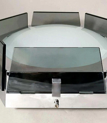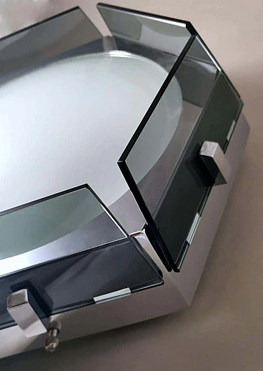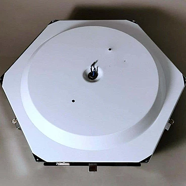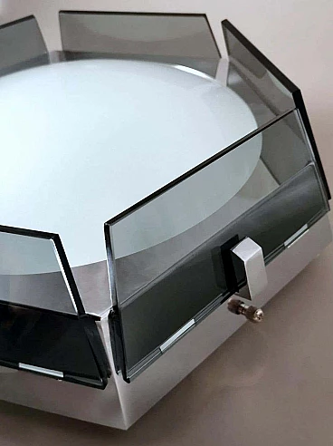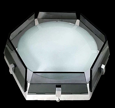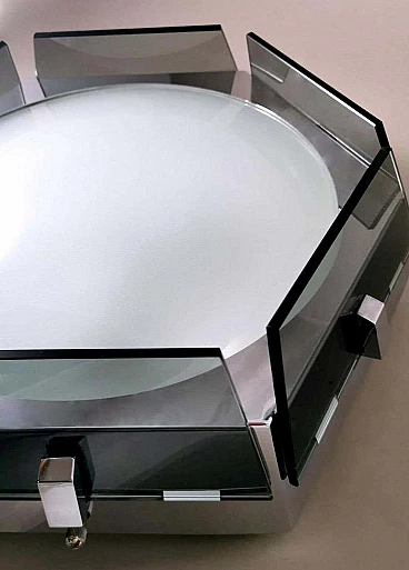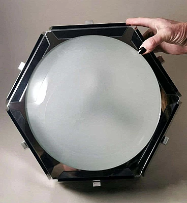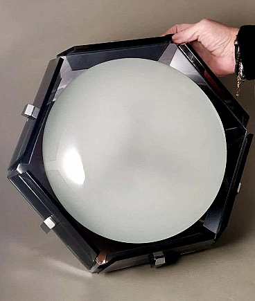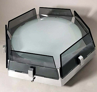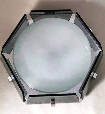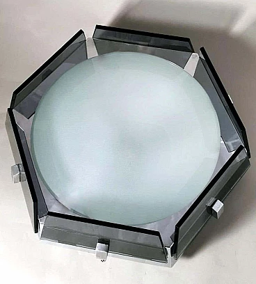 Iconic and large ceiling light with hexagonal steel structure with elements in gray and white satin glass. The massive grey elements are trapezoidal and have been ground and bevelled at the edges while the round concave glass in the center has the function of evenly spreading the light. The visible frame is made of steel, while the part that looks at the wall is glazed in white and has a step to keep the entire ceiling away from the wall so that it looks aesthetically lighter and suspended. Inside, easily accessible, is the lamp holder with three housings for bulbs whose wires come out from a hole in the back, also on the back there are two other holes to easily attach the ceiling light to the wall, which can be placed on the ceiling or used on a wall as a wall sconce. The ceiling light was produced between 1970 and 1973 in a workshop in Milan in perfect Fontana Arte style, a company that inspired many producers large and small. The prestigious company Fontana Arte was founded in Milan in 1932 by Luigi Fontana and Gio Ponti and has specialized in the processing of glass and the production of furnishing accessories, a prominent name in Italian design. Our ceiling light as well as a piece of furniture is an example of style. Elegant, rigorous and functional, it creates warm, lunar, shaded and enveloping atmospheres, giving new light to the eyes of the beholder. Measures diameter 33 cm, height 13 cm. The ceiling light is in good condition. The electrical system works but the wiring is European, an electrician should always check the compatibility of the voltage in other states before use. For all our shipments we use special packaging materials (wooden crates, polystyrene, etc.) for maximum protection and safety of the items.