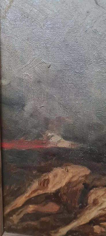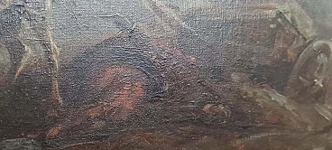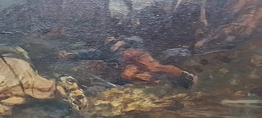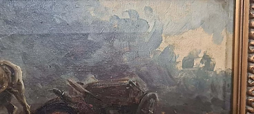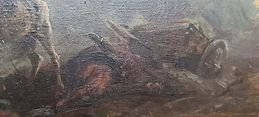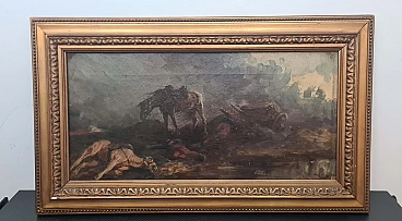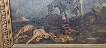 Oil painting on canvas by Vittorio Cajani entitled The Force of Destiny. Vittorio Cajani was a Turin painter born in 1848 who saw his greatest production in the second half of the 19th century. His depictions often dealt with scenes of horses or everyday popular life. The painting is painted in oil on canvas and depicts a battlefield; in the left foreground are a fallen horse and soldier while in the centre is a surviving horse intent on searching through the rubble. Light filters from the top right through a cloud of ash and dust from the violent battle that has just ended. Note the painter's ability to give a sense of tragedy through painting. The painting is signed in the lower left-hand corner and the title, The Force of Destiny, and signature are written in pencil on the back of the frame. Size of the canvas only: 29.5 x 59 cm.