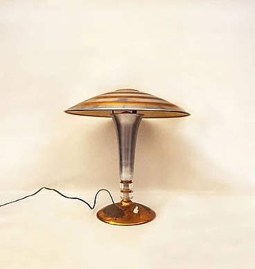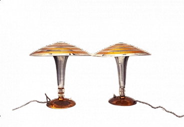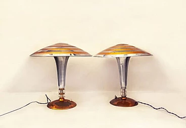 Pair of table lamps in chrome and copper metal, 1930s
