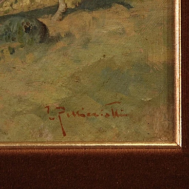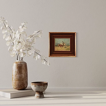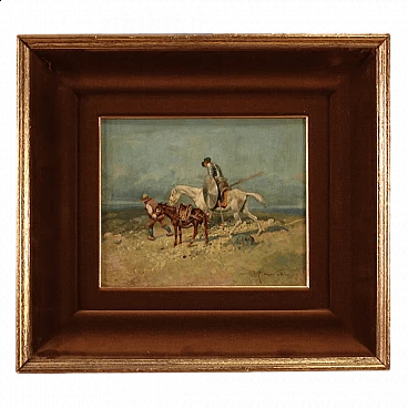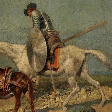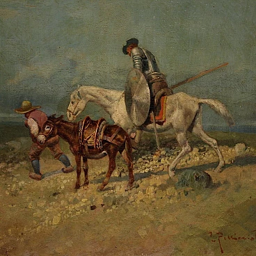 Italian painting from the first half of the 20th century. Oil on panel depicting landscape with figures and animals, Don Quixote and his faithful squire Sancho Panza, good hand painting. Signed picture in the bottom right (see photo) signature difficult to read, being studied. Small work of measure adorned with modern wooden frame, carved and gilded, with velvet decoration, in good condition. Well-painted tablet, of good brightness and a light background, for antique dealers, interior designers and collectors of works depicting subjects from the masterpiece of Miguel de Cervantes Saavedra. Picture in good condition and in beautiful patina. Painted light H 16 x L 20 cm.