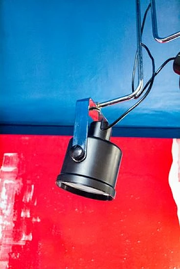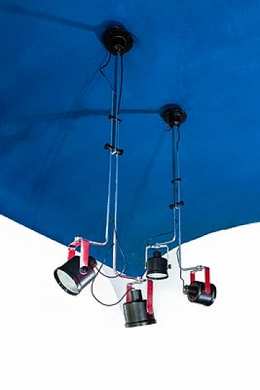 Two-light ceiling lamp in painted steel and aluminium. Adjustable and variable height. Designer Brusasco & Torrett, manufacturer Luci Milano, 1970s.