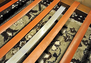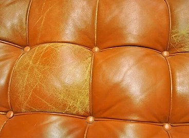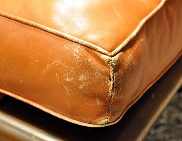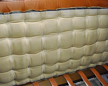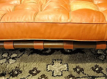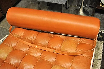 Iconic daybed designed by Mies van der Rohe and produced by Knoll International in the 1970s, with metal and wood structure and stitched cushion in light brown leather. Design attributed by consulting archival sources. Some defects due to wear as shown in the photo.