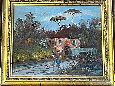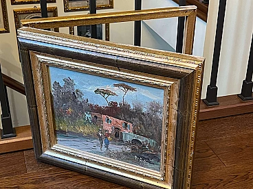 Safe cover painting with landscape, buildings and figures, early 20th century