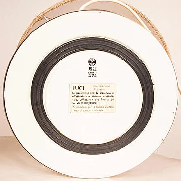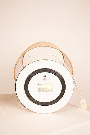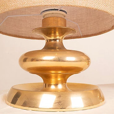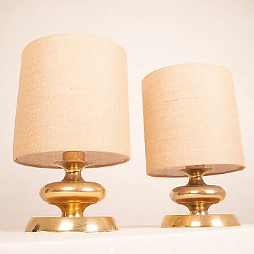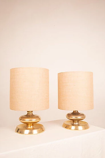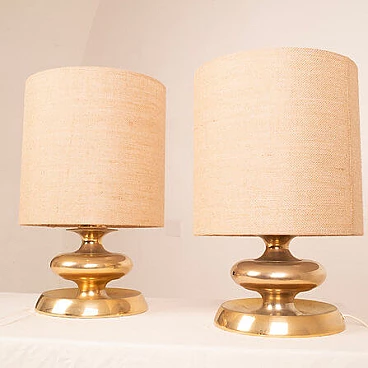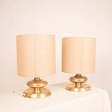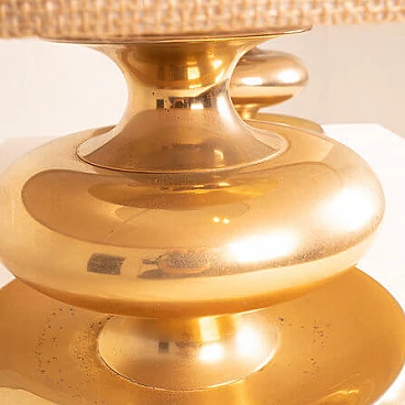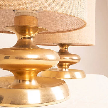 Extraordinary and very rare pair of table lamps mod. C-363 in the most precious version, namely bathed in 24k gold, produced by the well-known company Luci Italia between the end of the 1960s and the beginning of the 1970s. The lamps are in excellent and original condition, as shown in the photographs; they have the original brand and label demonstrating the quality of the product. New lampshades in raw natural fiber complete this extraordinary pair of lamps. The height indicated includes the lampshade. Currently unique on the market.