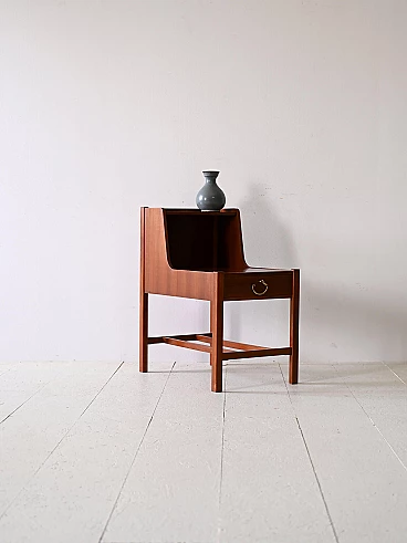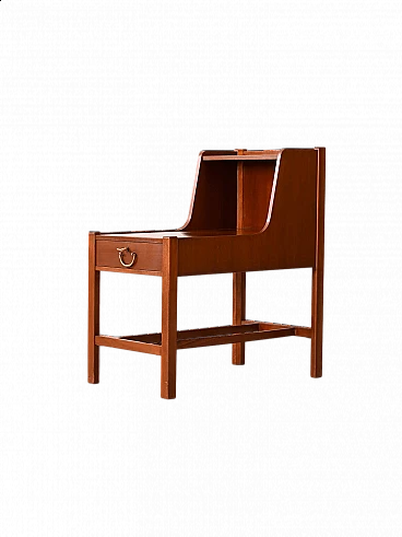 Swedish teak bedside table by David Rosén, 1960s. Its unusual shape, given by the double shelf, adds a distinctive touch, making it perfect for placing a lamp on the first shelf and keeping the second free for other objects. Square legs give stability and solidity, while the shelf above the drawer adds extra space for additional decorative items or daily necessities. Good condition. A conservative restoration was done using natural materials. It may show some signs of time. Please pay attention to the photographs.