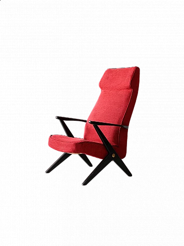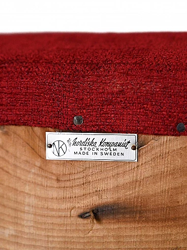 Armchair by Bengt Ruda for NK Nordiska Kompaniet, original 1950s. This distinctive armchair is wrapped in a vibrant shade of red. The black-colored wooden structure emphasizes the contrast and gives it a sophisticated look. X-shaped legs contribute to a stable, modern base, while armrests add timeless elegance to the armchair's Nordic design. Good condition. A conservative restoration with natural products has been carried out. It may show some signs of time. Please pay attention to the photographs.