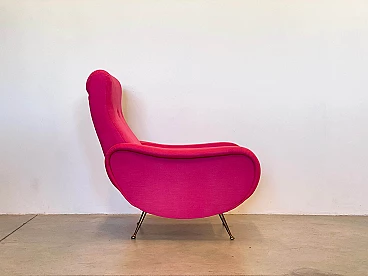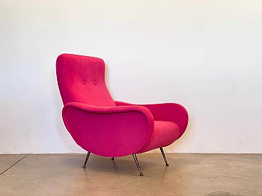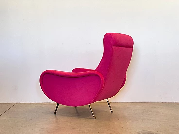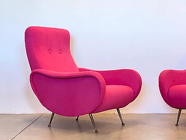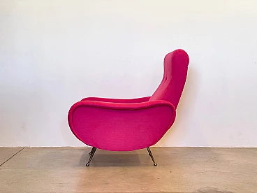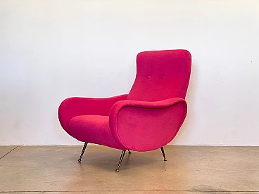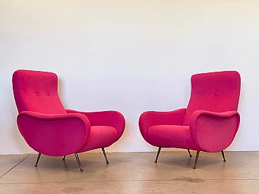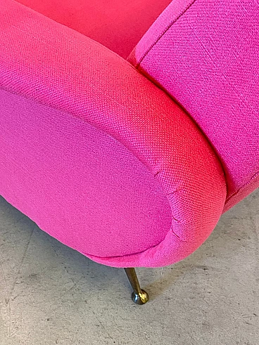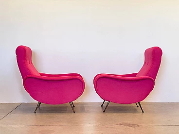 Pair of armchairs in the style of Marco Zanuso, 1950s. Fuchsia fabric upholstery and brass feet. Padding and fabric are new.
