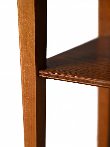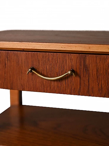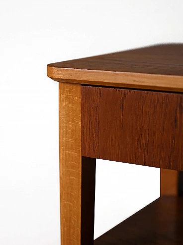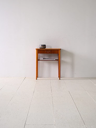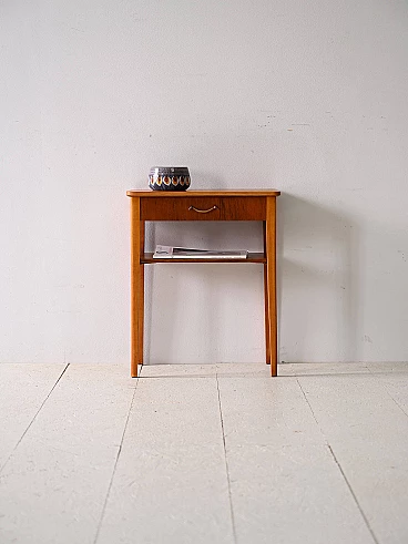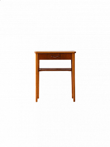 Original Scandinavian bedside table. Vintage teak bedside table from the 1950s, featuring a Scandinavian design that combines elegance and functionality. The metal handle adds a touch of sophistication to the drawer, while the rounded corners give it a simple and delicate look. Attention to detail is also evident in the presence of a practical magazine holder, offering an additional storage solution. This bedside table is an example of Scandinavian craftsmanship, with modern, clean lines that reflect the minimalism and distinctive elegance of this style. Good condition. A conservative restoration was carried out using natural materials. May show some signs of time. Please pay attention to the photographs.