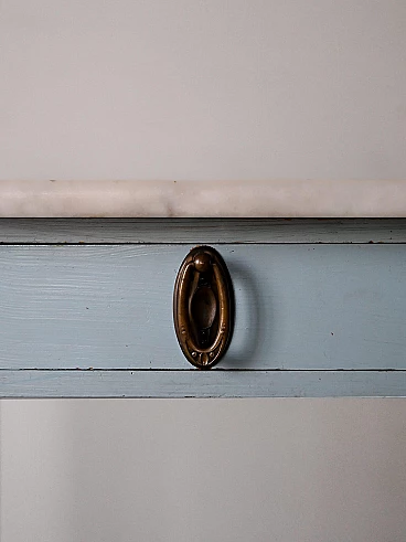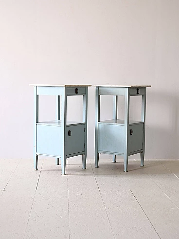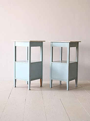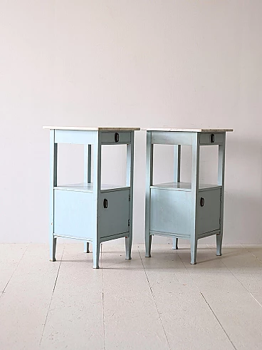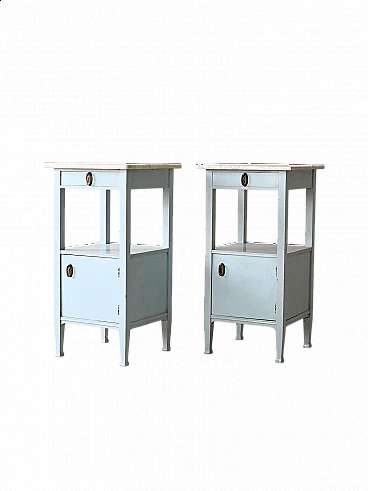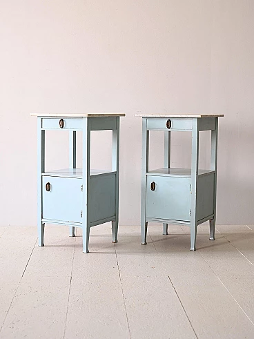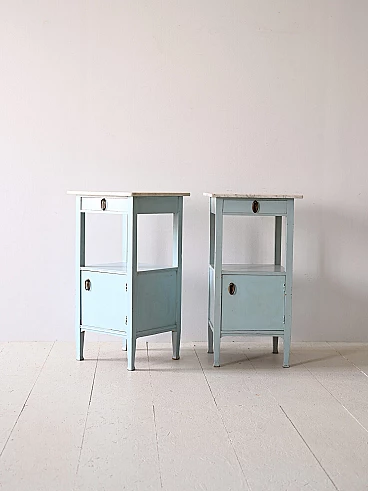 Original 1930s Nordic marble and wood bedside tables. Deco bedside tables with marble top and wooden frame painted blue. The handles are original of the period and the frame is very solid. Good condition, conservative restoration with natural products has been carried out. It may show some signs of time. Please pay attention to the photographs.