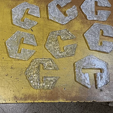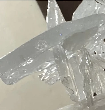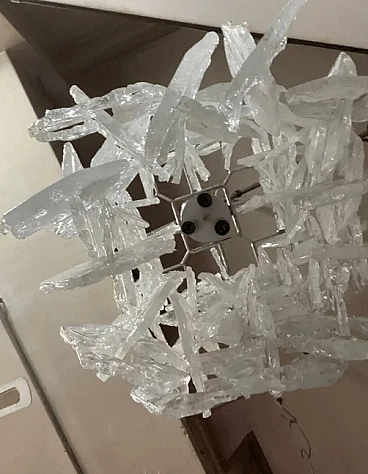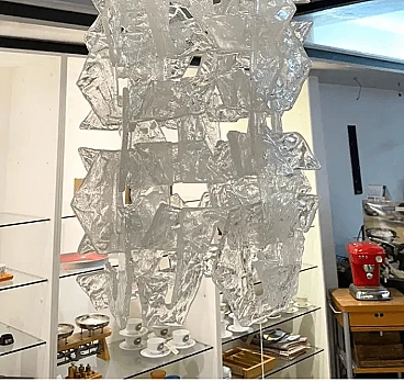 A white frosted Murano glass chandelier designed and manufactured in Italy in the 1970s. Consisting of a chromed part that supports the lamp holders and rows, each made up of seven ice-effect Murano glass elements connected to each other, it has never been used because it comes from an important lighting shop in Italy which is being discontinued. The Murano glass elements recall the surface of ice. The chandelier requires professional installation due to its size and the delicate nature of Murano glass.