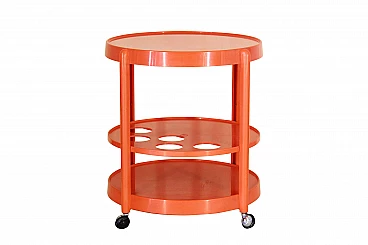 70s bar cart in excellent condition. Orange plastic frame and chrome wheels.