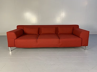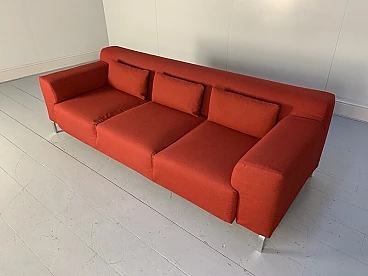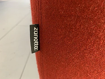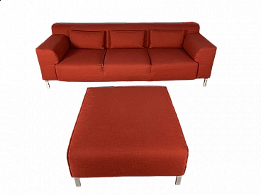 Three-seater 1323 Greg sofa and pouf/footstool by EMAF Progetti for Zanotta. Impeccably presented, dressed in a sublime and luxurious red Alpaca wool fabric. Excellent condition, never used, immaculate fabric; perhaps it has some slight marks on the legs. Used only as a furniture sample in the showroom. Well-stretched fabric and firm cushions. Steel frame, top-of-the-line upholstery in soft red Alpaca virgin wool. Chrome-plated legs. The sofa is 67 cm high, 222 cm wide and 90 cm deep; the seat is 40 cm high. The pouf is 40 cm high, 80 cm wide and 90 cm deep.