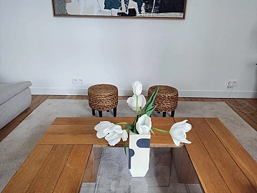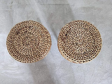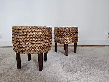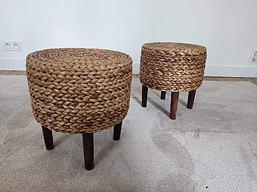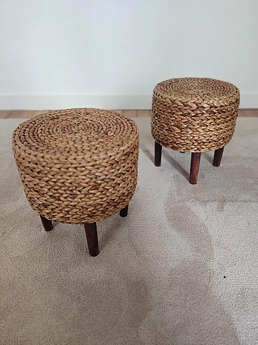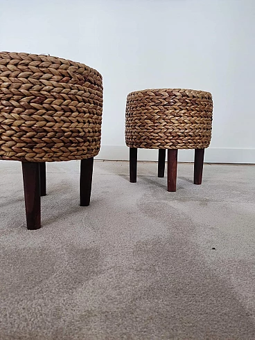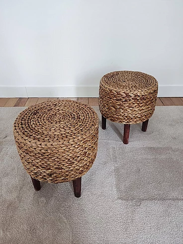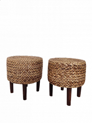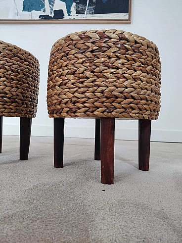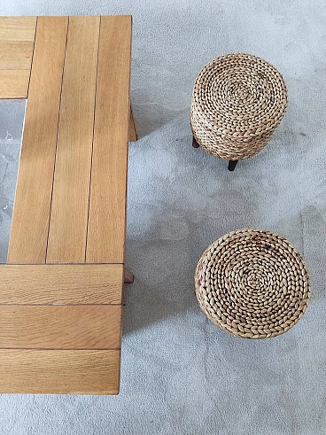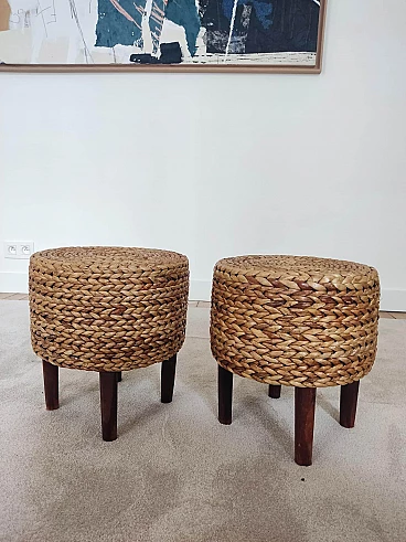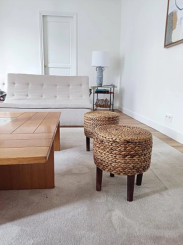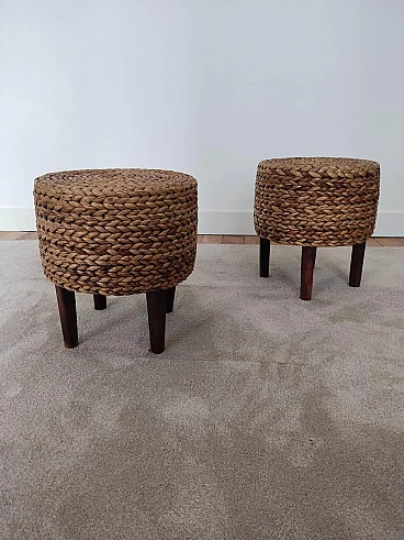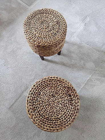 Pair of small wooden and rope stools in the style of Adrien Audoux and Frida Minet, 1940s-50s. They will give a lot of elegance to the living room next to a coffee table. Good overall condition. On request, possibility to buy one stool (for further information contact the seller).