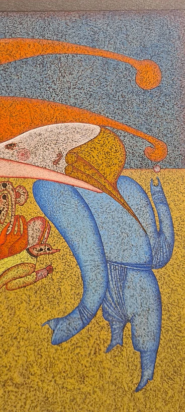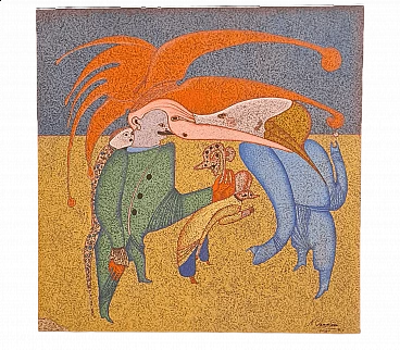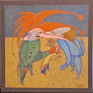 Mixed media painting on cardboard by Russian artist Mihail Chemiakin belonging to the Carnival of Saint Petersburg series. Created in mixed media using Indian ink, wax crayons and watercolours. The painting depicts Saint Petersburg carnival masks drawn in the unmistakable style of the author, who distorts them to such an extent that they appear monstrous. The painting is signed in ink and dated 1981 in the bottom right-hand corner. Mihail Chemiakin (1943) is a Russian painter who later moved to America; he is a controversial representative of the non-conformist artistic tradition of Saint Petersburg. In 1993 he received the State Prize of the Russian Federation. The work is in perfect condition and has no defects. Size without frame: 32 x 32 cm.