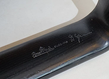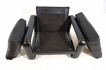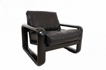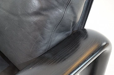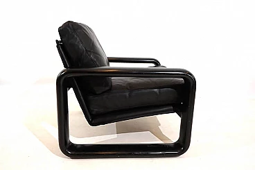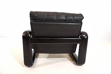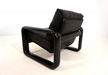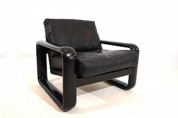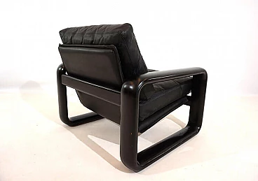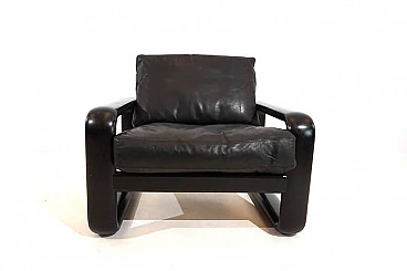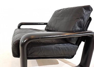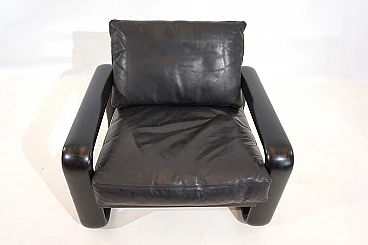 Hombre leather armchair in the most popular version with a black wooden frame and black leather in excellent condition. The leather of the cushions and backrest shows hardly any signs of wear and tear and is soft and supple. The solid wooden backrests show minimal patina. The model is the low-back variant. A great vintage classic. Rosenthal, known as one of the most important porcelain manufacturers in the world, decided in the 1970s to have some furniture designed by well-known designers and market it under the Rosenthal brand name. This gave rise to some design icons of the 1970s, including this Hombre collection, designed by Burkhard Vogtherr.