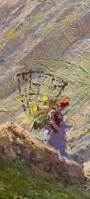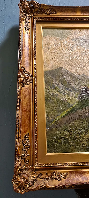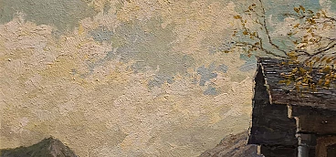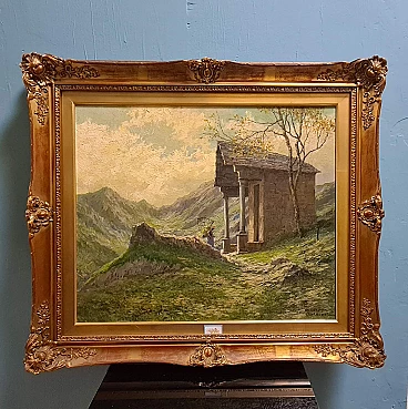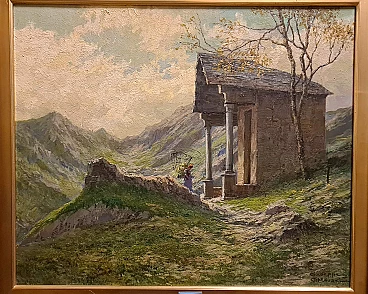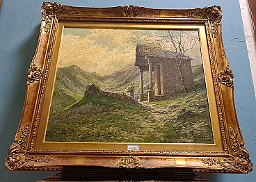 Alpine landscape in oil on panel by the painter Giuseppe Gheduzzi. Stunning mountain landscape depicting a peasant woman in front of a small mountain church. In the background of the little church are summery rocky mountains and a cloudy sky lit by the sun. The painting is signed in the lower right-hand corner and is in excellent condition including the frame. The author Giuseppe Gheduzzi was born in Crespellano (BO) on 12 May 1889. The son of the painter Ugo, from whom he learnt, like his brothers Cesare, Mario and Augusto, the first rudiments of art. He refined his training in Turin at the Accademia Albertina as a pupil of Andrea Marchisio and Paolo Gaidano. His genre scenes and paintings depicting interiors of craftsmen's workshops, antique dealers and stables are particularly appreciated by the public and critics. Height 50 cm; width 60 cm.