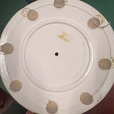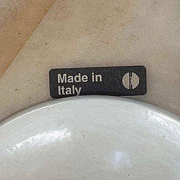 A very elegant, round coffee table with a white painted cast aluminium pedestal and a white Carrara marble top. A perfect example of minimalism, with a slender but solid and sturdy form. It has the original production label intact. The paint on the tapered foot bears the signs of use and years, as can be seen in the photos.